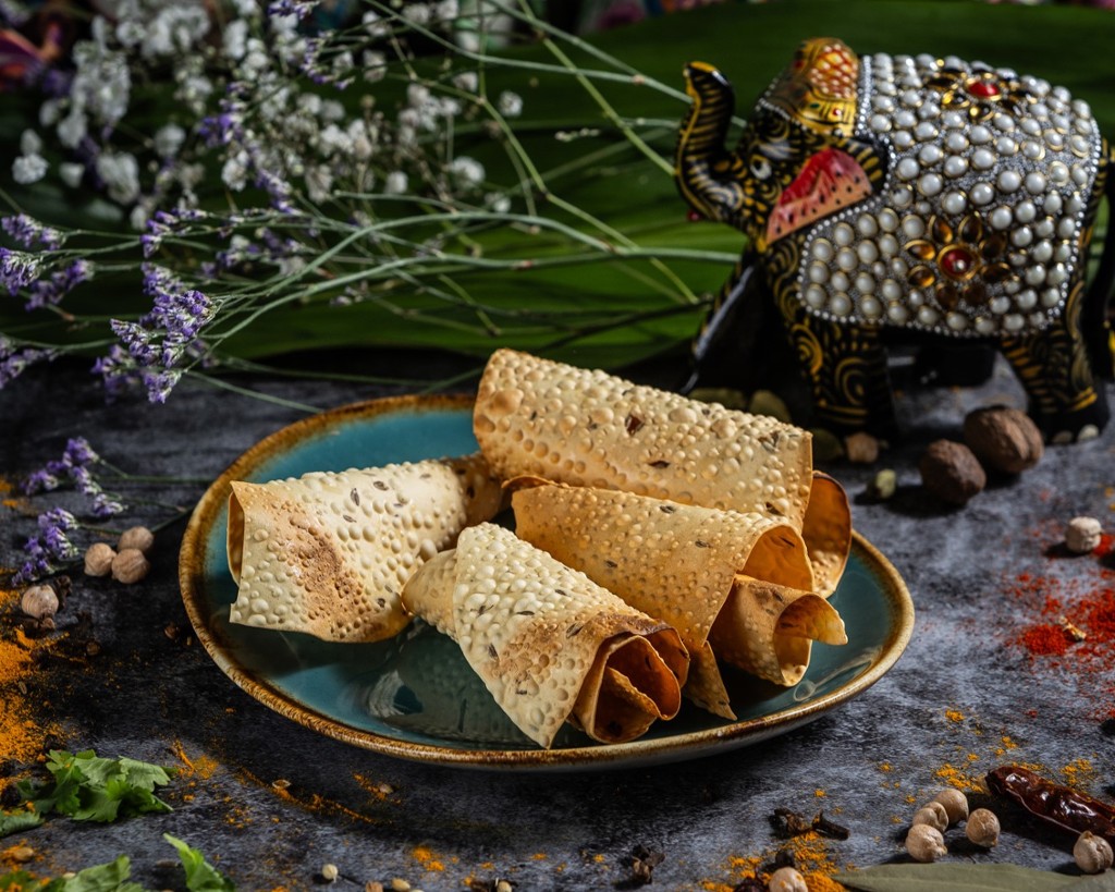 Crisp and salty urid lentil wafel with cumin roasted in tandoori oven