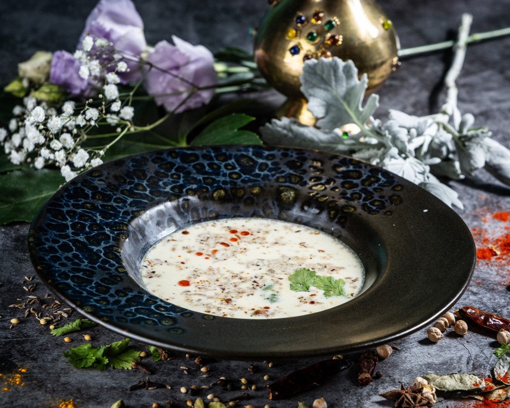 A silky garlic cream soup enriched with a blend of Indian spices. The intense garlic flavour is combined with a soft creaminess and spice.