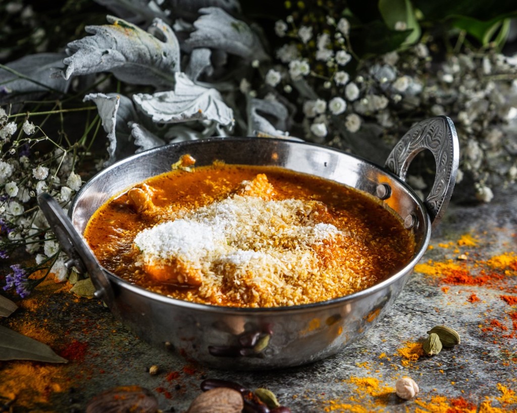 A hot-citrus dish from southern India, featuring chicken cooked in a tomato-based sauce with robust Madras curry spices. This dish is perfect for those who love their food with a strong, spicy kick.