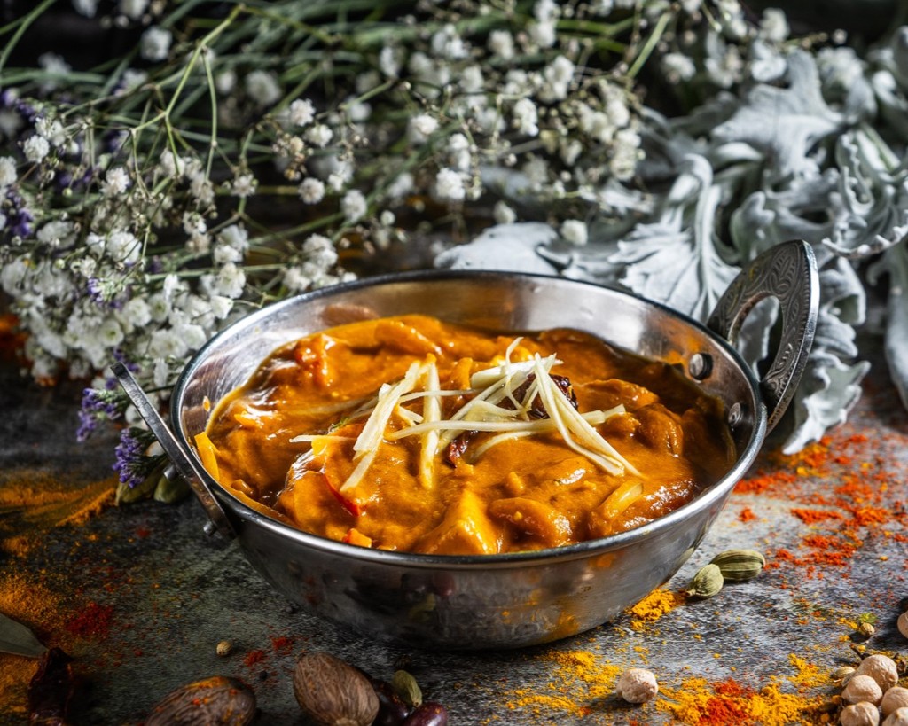 Kesudiós hagymás paradicsomos szószban főtt csirke görögszénával fűszerezve.