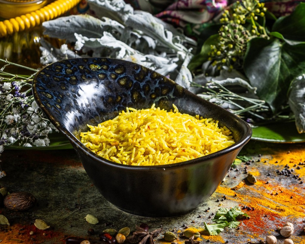 Basmati rice steamed with turmeric root powder