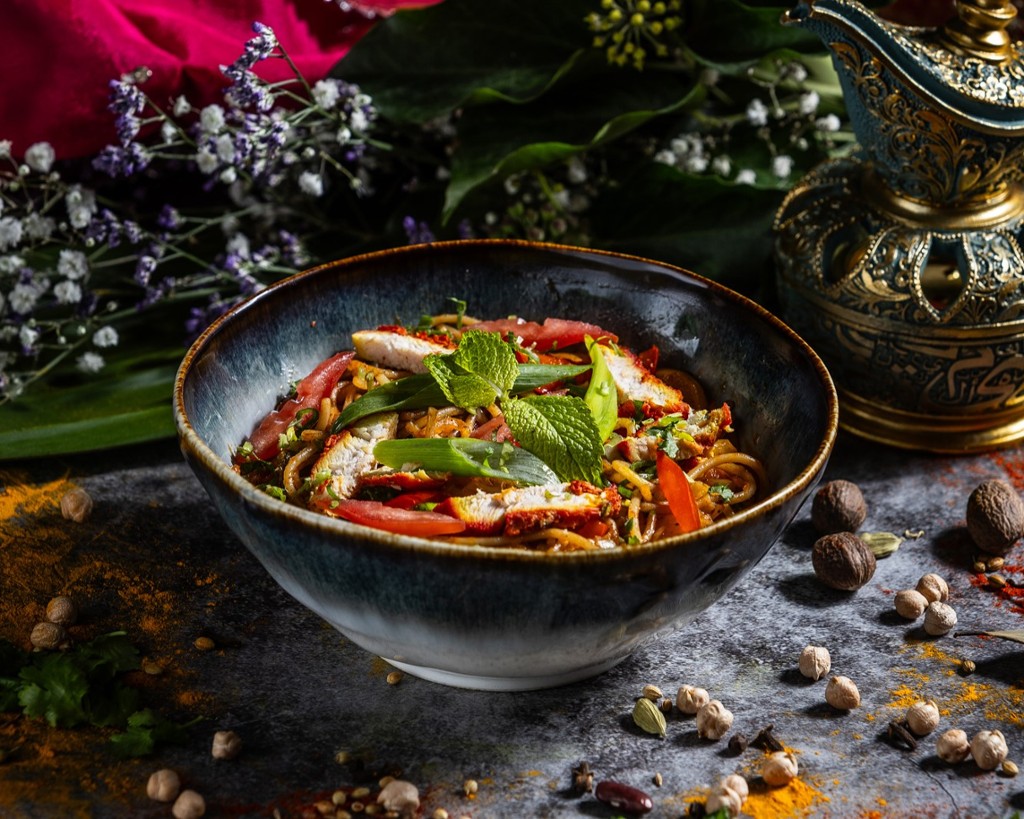 Noodles seasoned with chicken pieces and Indian spices. A light yet spicy dish that blends noodles and the richness of spices.