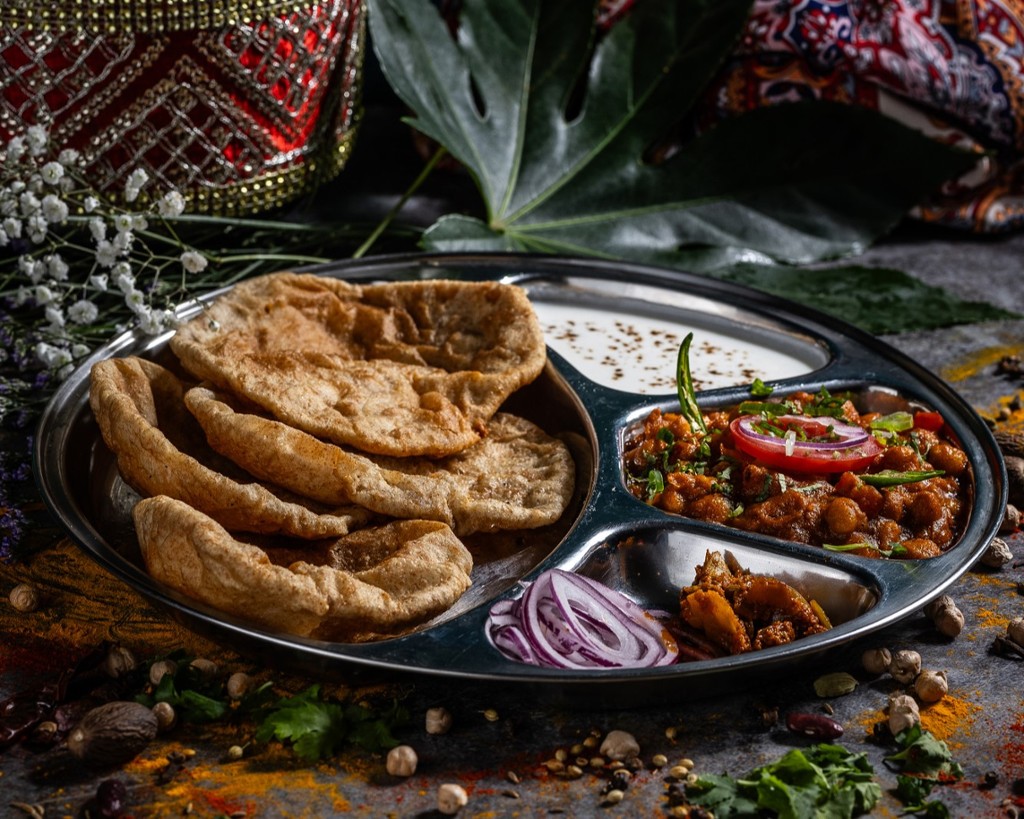 Light, fluffy, fried Indian bread served with spiced potatoes. This dish combines the soft texture of bread with rich potato flavor.