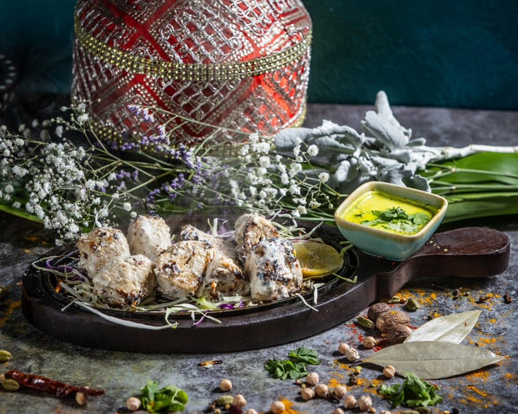 Pepper-, cheese- and cashew paste marinated, tandoor grilled seasoned chicken breast bits
