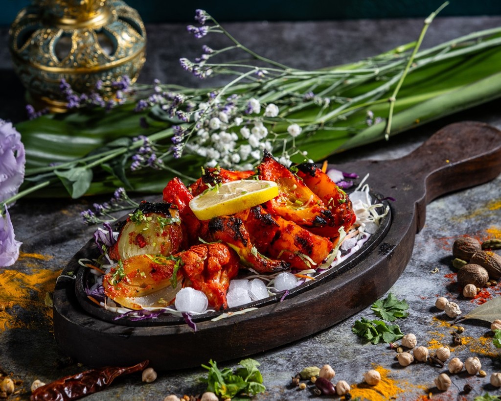 Seasoned yogurt and garlic-ginger marinated vegetables with homemade paneer cheese, grilled in tandoor oven
