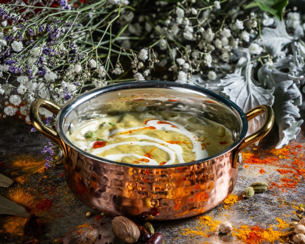Vegetables cooked in a thick gravy of cashews, cream and Indian spices