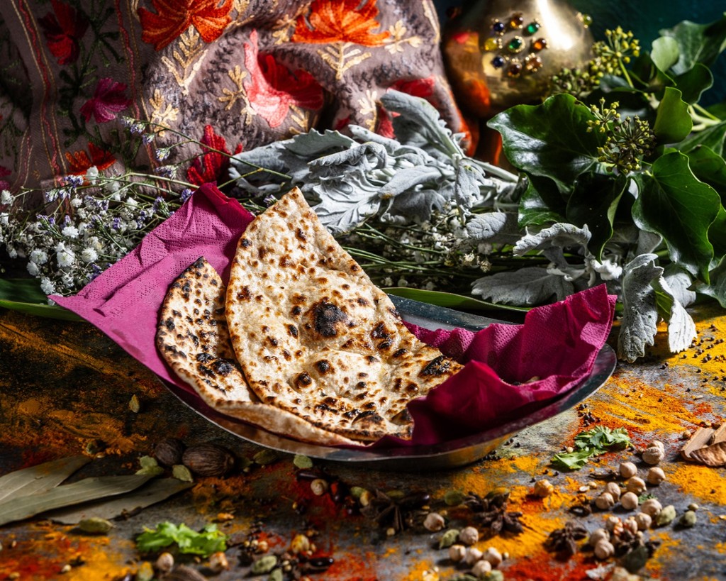 Tradicionális tandoorban sült kovász nélküli teljes kiőrlésű lepénykenyér vajjal gazdagítva.