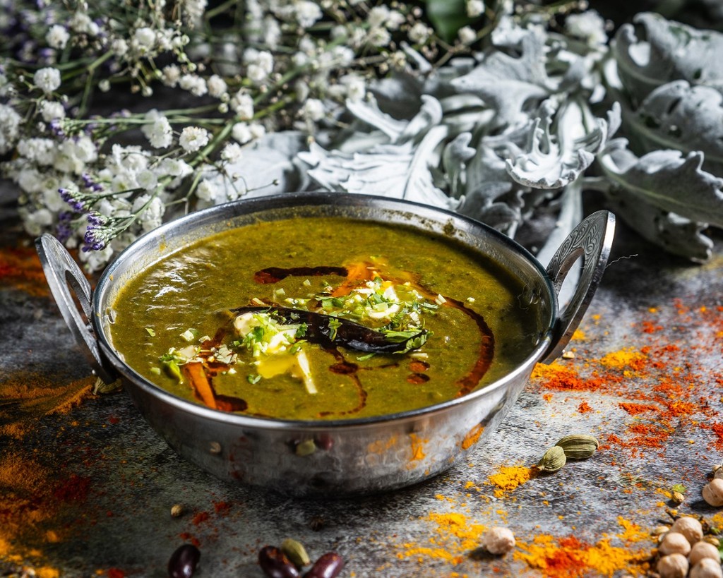 Tradicionális módon elkészített punjabi étel, mustárlevelek spenóttal, zöld chilivel, fokhagymával, hagymával és gyömbérrel. Egy autentikus vegetáriánus fogás.